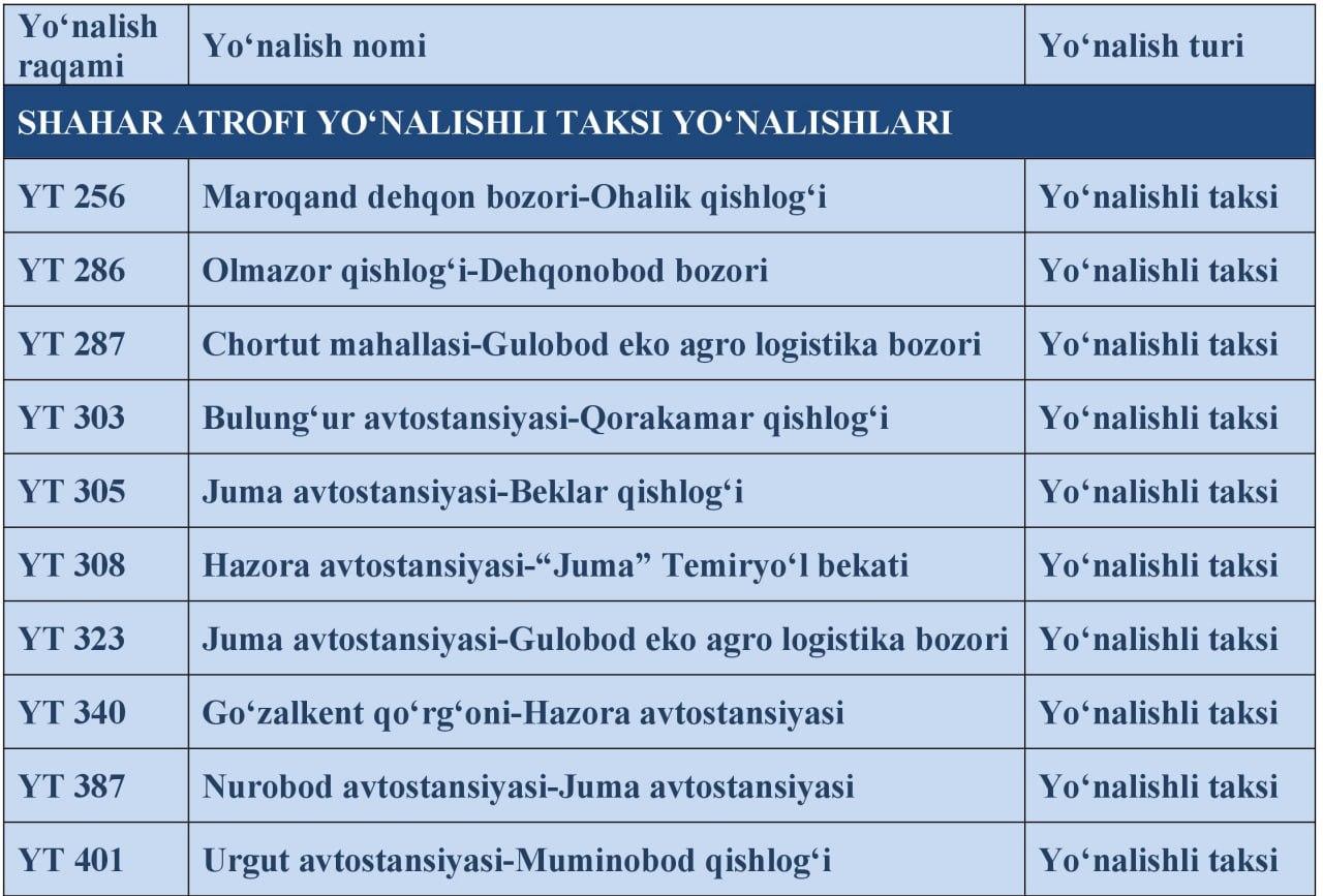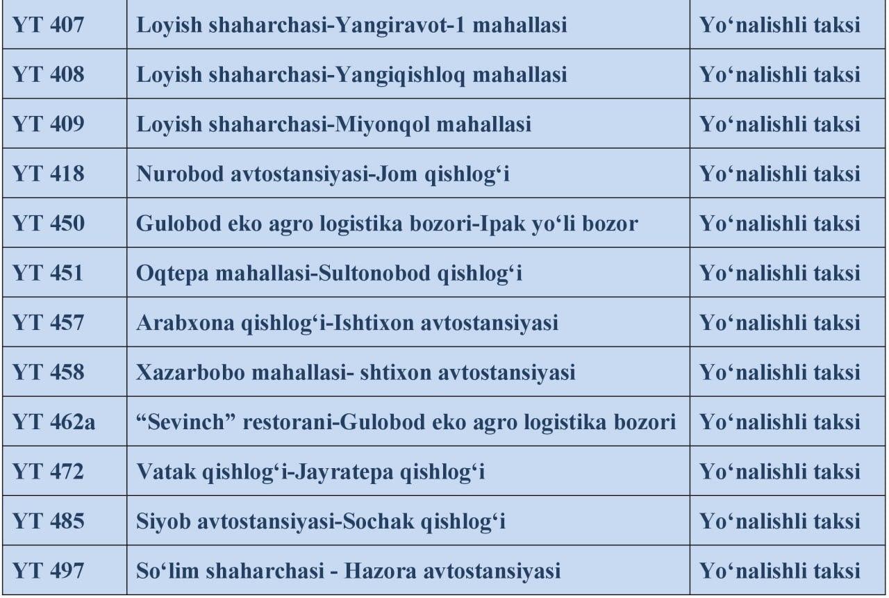 Aholining jamoat transportiga bo‘lgan ehtiyojini qondirish maqsadida quyidagi yo‘lovchi tashish yo‘nalishlari ochiq elektron tenderga qo‘yildi.