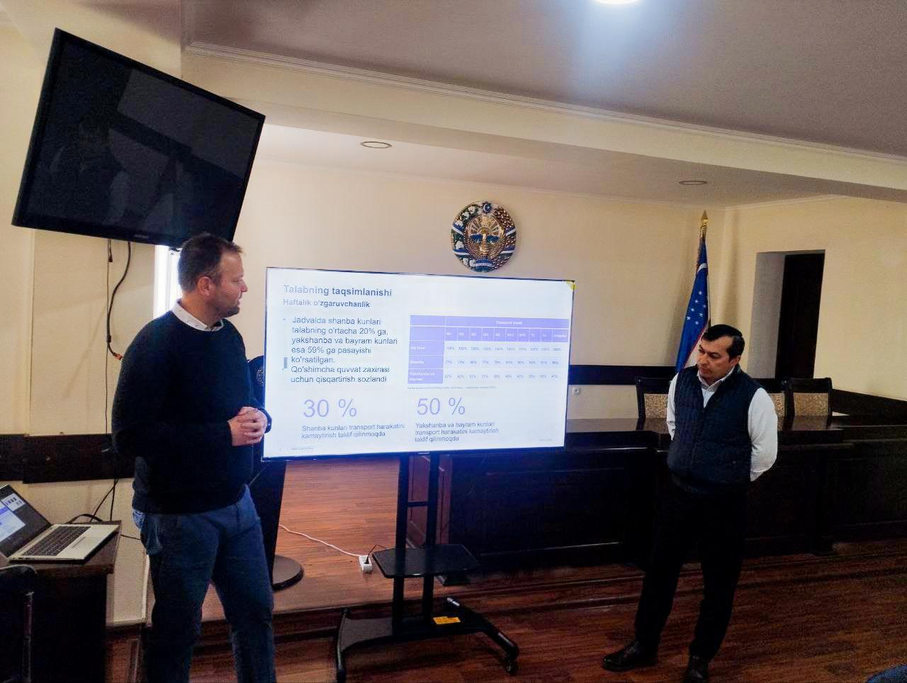 Mazkur loyihani amalga oshirishda bank tomonidan yollangan Yevropaning “Mott Macdonald” konsultantlari bilan navbatdagi ishchi uchrashuv bo‘lib o‘tdi. O‘zbekiston Respublikasi Transport vazirining birinchi o‘rinbosari M.Omarov ishtirokida Samarqand elektrobuslar loyihasining 2-bosqichi loyiha-oldi hujjatlarini tayyorlash yuzasidan bir qator masalalar muhokamasi amalga oshirildi.